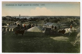 Alrededores de Angol durante las cosechas. Chile [fotografía] / Juan M. Sepúlveda V. Chile : Juan M. Sepúlveda V. , [Entre 1912 y 1922]. 1 tarjeta postal : colotipo, fotomecánico policromo sobre papel fibra ; 14 x 9 cm. .