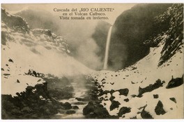 Cascada del "RIO CALIENTE" en el Volcan Calbuco. Vista tomada en invierno. [fotografía] / Hotel Bella Vista. Puerto Varas : Hotel Bella Vista, 1927. 1 tarjeta postal : huecograbado, monocromo, gelatina sobre papel fibra ; 14 x 9 cm. .