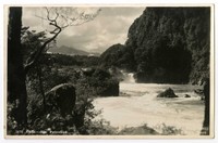 1835. Chile. Rio Petrohué [fotografía] / Foto Mora. Santiago: Foto Mora , [Entre 1930 y 1940]. 1 tarjeta postal : fotografía, monocromo, gelatina sobre papel fibra ; 14 x 9 cm. .