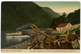 Puerto Blest, Lago Nahuelhuapi [fotografía] / Mattensohn & Grimm. Concepción : Mattensohn & Grimm, [entre 1911 y 1913]. 1 tarjeta postal : medio tono, fotomecánico policromo sobre papel ; 14 x 9 cm. .