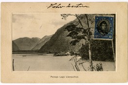 Paisaje Lago Llanquihue [fotografía]. Chile : [Editor no identificado], 1914. 1 tarjeta postal : colotipo, fotomecánico monocromo sobre papel ; 14 x 9 cm. .