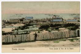 Punta Arenas Vista desde el Rio de la Mano [fotografía] / Peletería "El Zorro". Punta Arenas : Peletería "El Zorro" , [Entre 1904 y 1915]. 1 tarjeta postal : colotipo, fotomecánico policromo sobre papel ; 14 x 9 cm. .