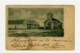 Vista de la primera iglesia de la ciudad; edificada en madera, construida entre septiembre de 1891 y febrero de 1892, bajo el diseño arquitectónico del sacerdote, misionero salesiano e ingeniero, nacido en Trento, Juan Bernabé Radigatti; un incendio la destruye en junio del mismo año. En este sitio, hoy se encuentra la Catedral de Punta Arenas.