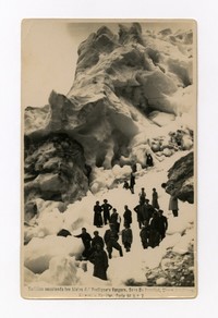 Turistas escalando los hielos del Ventisquero Vergara, Seno D'Agostini, Tierra del Fuego [fotografía] / Handler. Punta Arenas : Handler , [1930]. 1 tarjeta postal : fotografía, monocromo, gelatina sobre papel ; 9 x 14 cm. .
