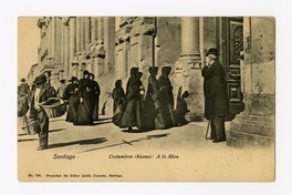 Santiago Costumbres chilenas: A la misa [fotografía] / Adolfo Conrads. Santiago : Adolfo Conrads, [Entre 1907 y 1910]. 1 tarjeta postal : colotipo, fotomecánico monocromo sobre papel ; 14 x 9 cm. .