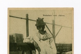 Costumbres Nacionales. Chile Verdadero roto chileno [fotografía]. Chile : [Editor no identificado, Entre 1900 y 1910]. 1 tarjeta postal : huecograbado, fotomecánico monocromo sobre papel ; 9 x 14 cm. .