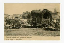 Venta de sandias en el Mercado de Santiago [fotografía] / J. Allan. Concepción : J. Allan , [entre 1910 y 1919]. 1 tarjeta postal : colotipo, fotomecánico monocromo sobre papel fibra; 14 x 9 cm. .