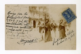 Vista tomada del natural hace 4 dias en el centro de Santiago [fotografía]. Chile : [Editor no identificado], 1909. 1 tarjeta postal : fotografía, monocromo, gelatina sobre papel fibra ; 14 x 9 cm. .