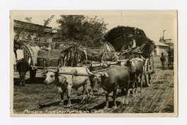 Materias: Vendedores ambulantes - Carretoneros - Historia - Fotografías - Chile - Características nacionales chilenas - Hombres - Tarjetas postales - Yunta de bueyes