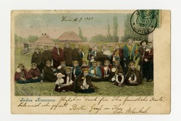 Indios Araucanos [fotografía]. Chile : [Editor no identificado], 1904. 1 tarjeta postal : fotografía, monocromo coloreado, gelatina sobre papel fibra ; 14 x 9 cm. .