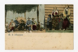 En la Araucania [fotografía]. Chile : [Editor no identificado , Entre 1899 y 1909]. 1 tarjeta postal : fotografía, monocromo coloreado, gelatina sobre papel fibra ; 14 x 9 cm. .