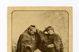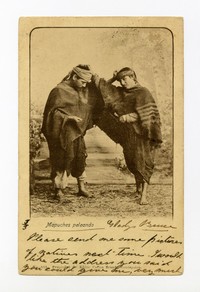 Mapuches peleando [fotografía] / Carlos Brandt. Concepción : Carlos Brandt , 1905. 1 tarjeta postal : colotipo, fotomecánico monocromo sobre papel ; 9 x14 cm. .