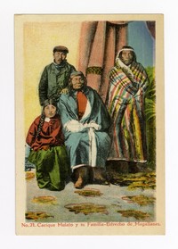 No. 21. Cacique Mulato y su Familia- Estrecho de Magallanes [fotografía] / Librería de Marangunic y Cia. Punta Arenas : Librería de Marangunic y Cia., [19uu]. 1 tarjeta postal : colotipo, fotomecánico policromo sobre papel ; 9 x 14 cm. .