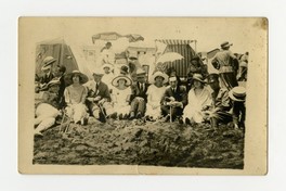 [Retrato grupal en la playa de un balneario] [fotografía]. Viña del Mar: [Editor no identificado] , [Entre 1909 y 1920]. 1 tarjeta postal : fotografía, monocromo, gelatina sobre papel ; 14 x 9 cm. .