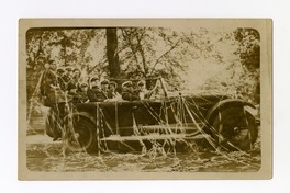 Fiesta de Estudiantes, Quinta Normal [auto con estudiantes y confetti] [fotografía]. Chile : Casa Hans Frey , 1928. 1 tarjeta postal : fotografía, monocromo, gelatina sobre papel ; 14 x 9 cm. .