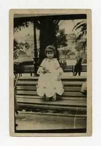 [Niñita con traje de fantasía; está de pie en un escaño de la plaza] [fotografía]. Chile : [Editor no identificado, Entre 1919 y 1929]. 1 tarjeta postal : fotografía, monocromo, gelatina sobre papel ; 14 x 9 cm. .