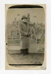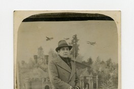[Retrato plano general de un hombre; vestido con abrigo, bufanda, sombrero y guantes; con un telón de fondo como escenario, muestra el cerro Santa Lucía y el sobrevuelo de aviones y un aeroplano] Chile : [Editor no identificado] , 1938. 1 tarjeta postal : fotografía, monocromo, gelatina sobre papel ; 8,3 x 12 cm. .