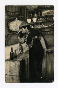 [En una cantina: Actor disfrazado de "verdejo", representación del vagabundo chileno] [fotografía] Zapallar : [Editor no identificado], 1939. 1 tarjeta postal : fotografía, monocromo, gelatina sobre papel fibra ; 8,7 x 13,7 cm. .