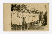 [Retrato de un grupo de deportistas] [fotografía] Chile : [Editor no identificado , entre 1904 y 1920]. 1 tarjeta postal : fotografía, monocromo, gelatina sobre papel fibra ; 11,2 x 8,2 cm. .