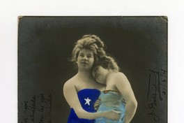 [Dos niñas adolescentes; vestidas con la bandera chilena y la bandera argentina] [fotografía] [Lugar no identificado : editor no identificado] , 1904. 1 tarjeta postal : fotografía, monocromo coloreado, gelatina sobre papel fibra ; 7,8 x 14 cm. cm. .