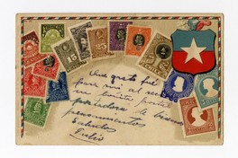 [Tarjeta postal ilustrada con sello postales de Correos de Chile y un emblema patrio] [fotografía]. Chile : [Editor no identificado , 19uu]. 1 tarjeta postal : colotipo, fotomecánico policromo sobre papel ; 14 x 9 cm. .