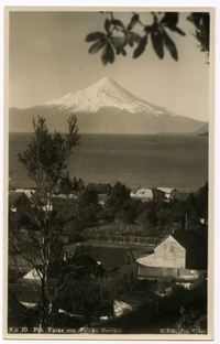 N.o 10 Pto. Varas con Volcán Osorno [fotografía] / E. Karl. Puerto Varas : E. Karl , [entre 1930 y 1940]. 1 tarjeta postal : fotografía, monocromo, gelatina sobre papel fibra ; 9 x 14 cm. .