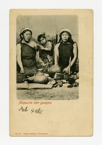 Mapuche con guagua [fotografía] / Carlos Brandt. Concepción : Carlos Brandt , [19--]. 1 tarjeta postal : colotipo, fotomecánico monocromo sobre papel ; 9 x 14 cm. .