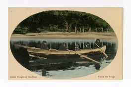 Indios Yaaganes Usuhaga Tierra del Fuego [en bote] [fotografía] / Peleteria "Magalla nes" Henry Poirier. Valparaíso : Peleteria "Magallanes" Henry Poirier , [Entre 1903 y 1908]. 1 tarjeta postal : colotipo, fotomecánico monocromo coloreado sobre papel ; 14 x 9 cm. .