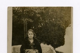[Retrato de una mujer joven en la plaza; sentada en un sillón de mimbre] Chile : [Editor no identificado , 19uu]. 1 tarjeta postal : fotografía, monocromo, gelatina sobre papel ; 12 x 8 cm. .