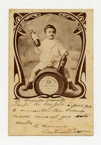 Tarjeta postal portadora de publicidad para la Viña San Pedro: Niño sostiene botellas de vino sentado en un barril.