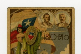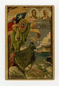 1810-1910 La Marina : [Centenario de la Independencia de Chile; retrato de Bernardo O'Higgins y Pedro Montt]. [fotografía] / [Valparaíso : Editor no identificado] , 1910. 1 tarjeta postal : medio tono, fotomecánico policromo sobre papel ; 8,8 x 13,5 cm. .