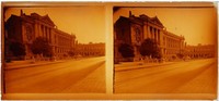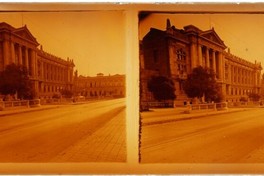 Monocromas estereoscópicas en que se inmortaliza el Palacio de los Tribunales de Justicia ubicado en calle Compañía entre Morandé y Bandera, antiguas instalaciones del diario el Mercurio y el Congreso Nacional.