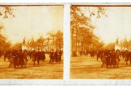 Monocromas estereoscópicas en que se inmortaliza a mujeres y hombres en el paseo de las Delicias más conocida como Alameda o Alameda del Libertador Bernardo O'Higgins, se aprecian con atuendos elegantes y se distingue la Estatua del Monumento al General José de San Martin.