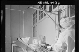 En una de las dependencias del Laboratorio Chile una enfermera retira desde la máquina de laboratorio [Maschinenfabrik] marca H.Struncke & Co. Köln-Ehrenfeld un tubo [de un examen de sangre]. Se observa otros materiales de salud.