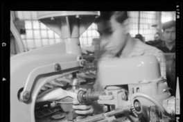 Joven obrero [o estudiante de la Escuela de Arte y Oficio] trabajando en unas máquinas área industrial.