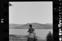 Imagen tomada de espalda a una mujer joven que traje de baño cubierto por un short blanco ; está parada frente a una laguna, al fondo hay unos cerros. Ella es la mujer que aparece en la imagen NBNB_0012 tocando la guitarra.