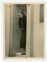 Adelina Casanova Vicuña, en la puerta de su casa; Calle Corbalán Melgarejo; hoy, Centro Cultural Gabriela Mistral (GAM); Barrio Lastarria [fotografía]. Santiago : [Editor no identificado, entre 1925 y 1930]. 1 fotografía : monocromo, gelatina sobre papel fibra ; 8,5 x 11,5 cm. .