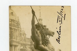 [Juan Casanova Vicuña y Franc Pesserl, junto a una escultura masculina de bronce; entrada del Museo Altes] Berlín-VII/1923 [fotografía]. Berlín : [Editor no identificado], 1923. 1 fotografía : monocromo, gelatina sobre papel fibra ; 8,7 x 13,7 cm. .