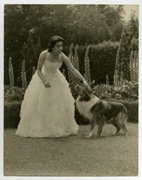 [Niña adolescente acaricia un perro Collie; lleva vestido largo de organdí bordado, con breteles anudado al cuello, arete y pulsera] [fotografía] Bob Borowicz.