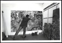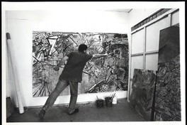 Imagen donde se aprecia en un plano general a Benjamín Lira, en taller, creando un collage.