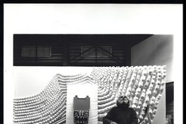 Imagen que inmortaliza a Federico Assler, en un plano general; se aprecia en el interior del taller, junto a sus esculturas de madera aglomerada con relieve.