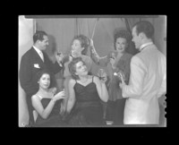 [María Elena Gertner, Mario Ortega, Marta Ubilla y Rosita Muñoz, brindis durante radioteatro en la radio Agricultura] [fotografía] Alfredo Molina Lahitte.