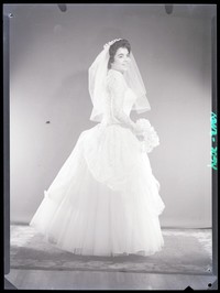 Nívea Paredes de Bahamondes [con su vestido de novia] [fotografía] / Alfredo Molina Lahitte. Santiago : Alfredo Molina Lahitte, [entre 1955 y 1965]. Negativo : monocromo, gelatina sobre acetato de celulosa ; 9 x 12 cm. .