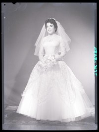 Nívea Paredes de Bahamondes [con su vestido de novia] [fotografía] / Alfredo Molina Lahitte. Santiago : Alfredo Molina Lahitte, [entre 1955 y 1965]. Negativo : monocromo, gelatina sobre acetato de celulosa ; 9 x 12 cm. .