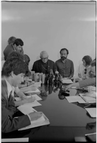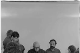 Monseñor Bernardino Piñera y José Cox Hunneus durante una conferencia de prensa en el año 1989. Entre los periodistas, Mónica Cerda.