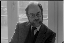 Entrevista a Sergio Bitar hecha por el priodista para la revista Apsi, Jorge Andrés Richards; se distingue un lienzo: PPD La fuerza del cambio