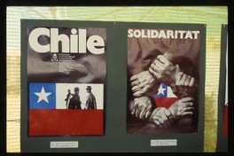 Portada de "Chile Solidaritat" en una exposicion fotográfica 1972, Berlín del autor Thomas Bilhardt. La imagen de dos campesinos en la portada y en la contra portada unas manos entrecruzadas.