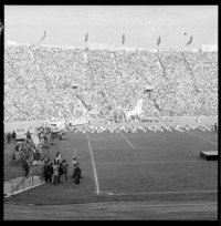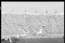Seguidores de Fidel Castro quie viaja en un vehículo abierto lo esperan en el sector de la Plaza Italia, camino al Estadio Nacional, todos portando carteles y banderas. Otras se ven llegando al primer centro deportivo por calle Grecia y algunos en las afueras y por último, ya instalados en las graderías del reciento deportivo.