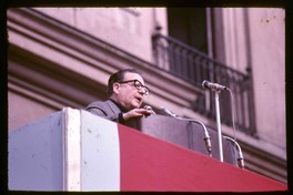 Materias: Calderón A., Rolando - Plaza de la Constitución(Santiago, Chile) - Rojas, Eduardo - Fotografías - Teitelboim, Volodia - Allende Gossens, Salvador - Corvalán, Luis - Partidos políticos - Palacio de La Moneda (Santiago, Chile) - Central Única de Trabajadores (Chile) - Bussi de Allende, Hortensia