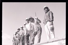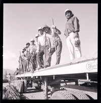 [Grupo de trabajadores, posan sobre una plataforma con ruedas] [fotografía] / Jack Ceitelis. Chile : Jack Ceitelis, 1972. Negativo : monocromo, gelatina sobre acetato de celulosa ; 6 x 6 cm. .